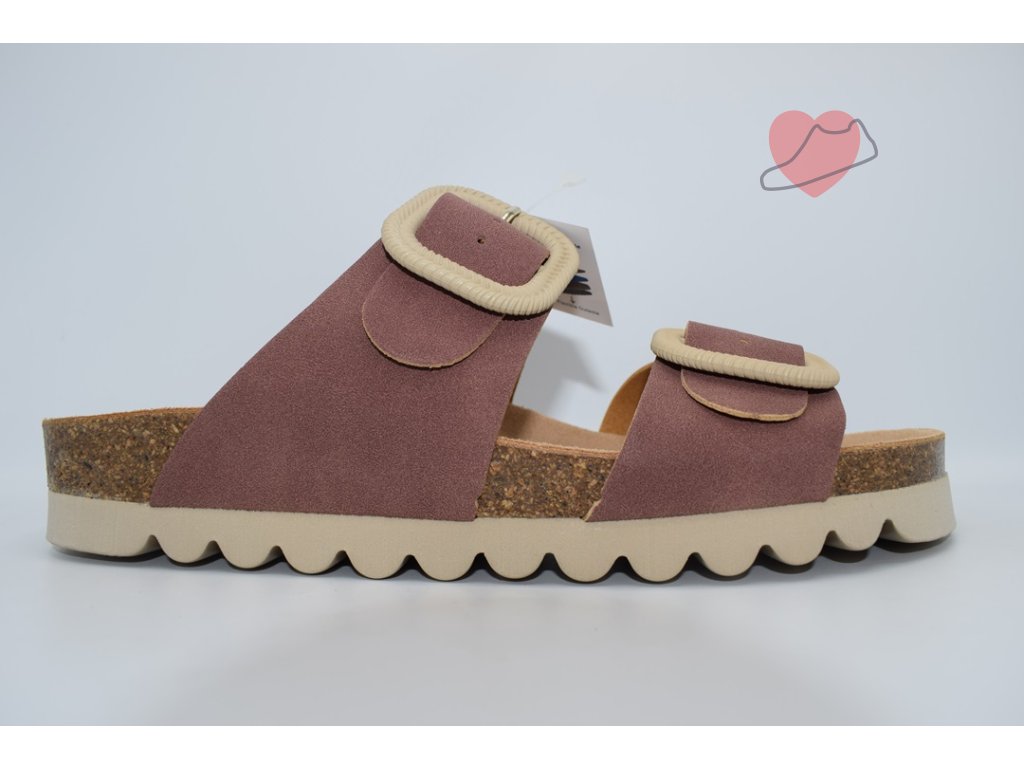 Dámský korkový pantofel s otevřenou špičkou v hnědé barvě. Anatomicky tvarovaná stélka. Pantofle jsou vhodné na venkovní i vnitřní užití. Regulace šířky na dvě přezky.