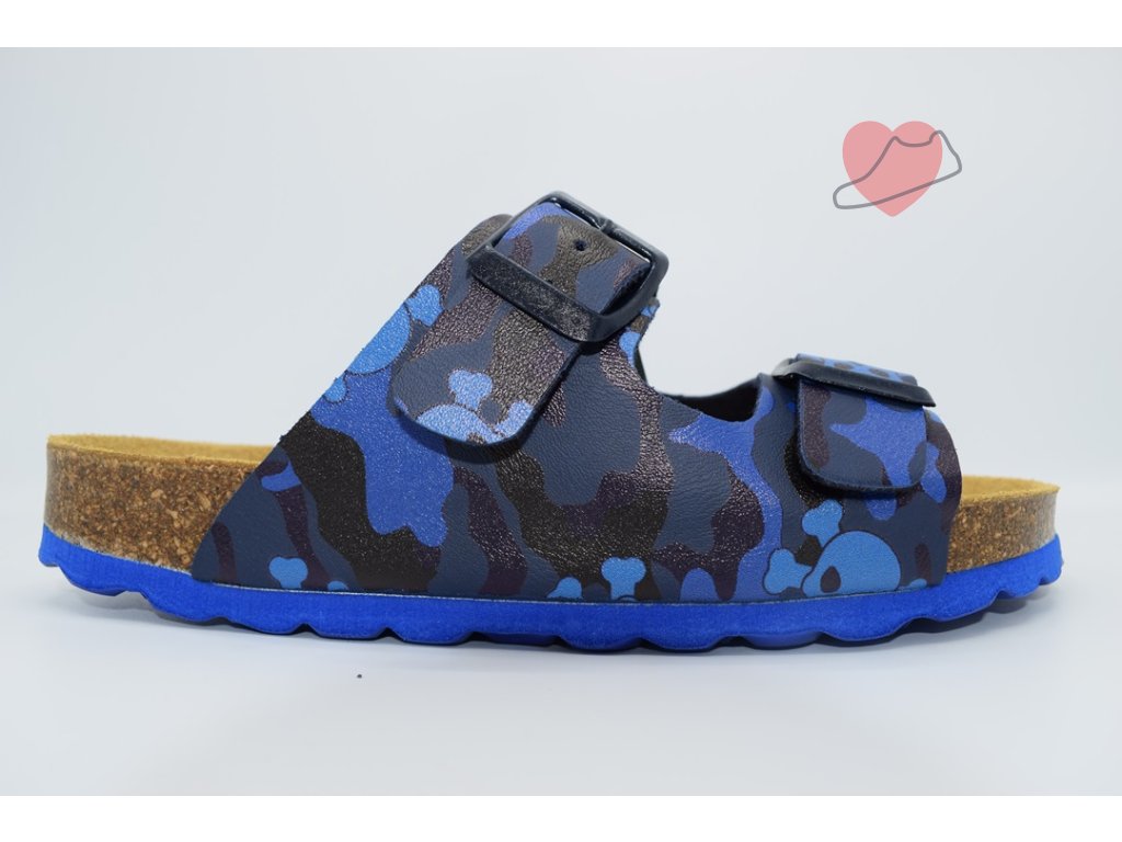 Dětský zdravotní korkový pantofel s otevřenou špičkou s lebkami. Anatomicky tvarovaná stélka a světlá podrážka jsou vhodné na venkovní i vnitřní užití. Regulace šířky na dvě přezky.