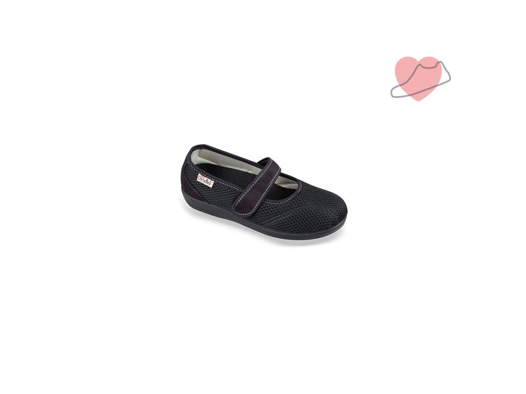 Textilní dámská anatomicky tvarovaná obuv s prodyšným svrškem je vybavená vyjímatelnou paměťovou stélkou, která se přizpůsobí chodidlu a zajistí chůzi jak na polštáři. Obuv je prostorná (šíře H). Stélka vhodná pro podporu klenby. Obuv vhodná pro různé deformity nohou např. halux, kladívkové prsty. Obuv s snadno nazouvá a díky suchému zipu a plné patě zabezpečí obuv pevnou chůzi.