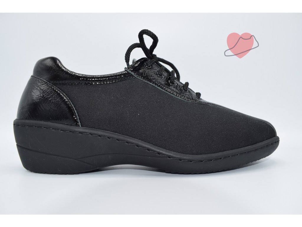 Dámská celoroční obuv na zavazování s pohodlně vyvýšenou patní částí. Obuv je velmi lehká, pohodlná a vyrobená z kombinace syntetického materiálu a kůže. Ideální obuv pro nohy s deformacemi palcového kloubu (hallux) a kladívkové prsty.