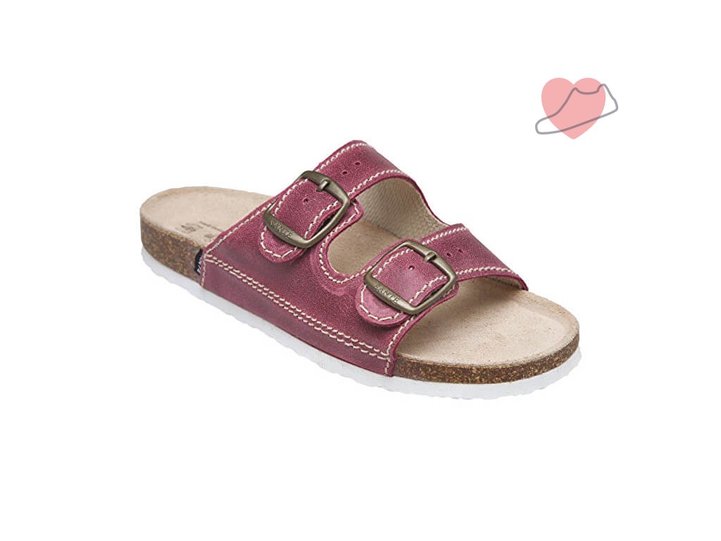 Dámský zdravotní korkový pantofel s otevřenou špičkou vínové barvy se světlou podrážkou. Anatomicky tvarovaná stélka a bílá podrážka jsou vhodné na venkovní i vnitřní užití. Regulace šířky na dvě přezky.