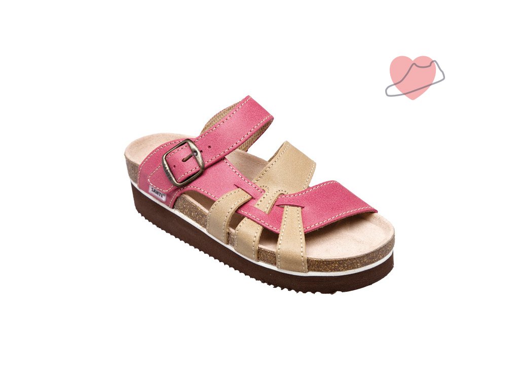 Dámský korkový pantofel s regulovatelnou šířkou na jednu přezku. Vyšší podešev mírně zvýšena v patní části, anatomicky tvarovaná stélka. Komfort při celodenní chůzi doma, v práci nebo venku.