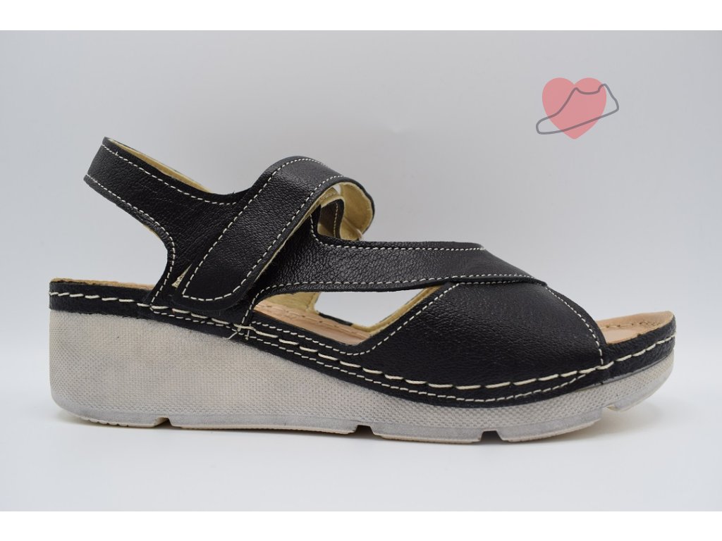 Dámské kožené sandály na cca 3 cm klínku s otevřenou špičkou zdobené kamínky. Boty jsou vybavené anatomicky tvarovanou stélkou potaženou kvalitní kůží.