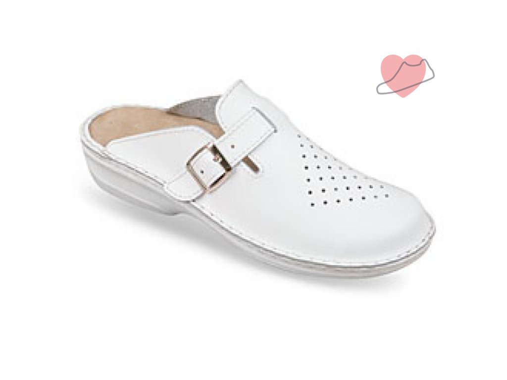 Dámské zdravotní pantofle jsou určeny profesionálům ve zdravotnictví, díky přírodnímu materiálu jsou pohodlné a prodyšné. Regulace šíře obuvi v oblasti nártu je možná pomocí nastavitelného pásku. Obuv má plnou špičku, protiskluzovou podešev a je certifikována v oblasti bezpečnosti práce. Jedná se o vystavenou obuv, jedna bota lehce zažloutlá od sluníčka.