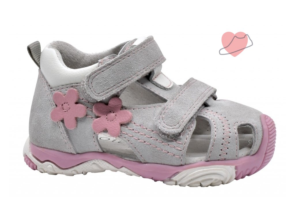 Dívčí sandály v šedo-růžové barvě s kytičkou, regulovatelné zapínáním na dva suché zipy. Pevná pata zabezpečí pro nohu dostatečnou oporu pro její rozvoj. Sandály jsou vypolstrované a mají koženou stélku s podporou klenby.