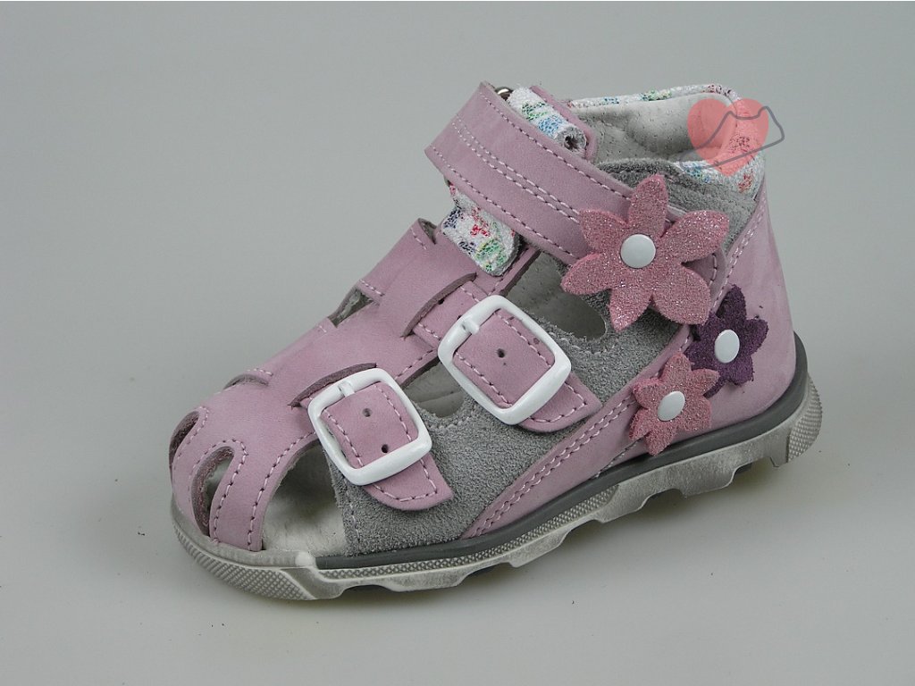 Dívčí sandály regulovatelné na dvě přezky a suchý zip. Krytá špička a pevná pata zabezpečí pro nohu dostatečnou oporu pro její rozvoj. Sandály jsou vypolstrované a mají koženou stélku s podporou klenby.