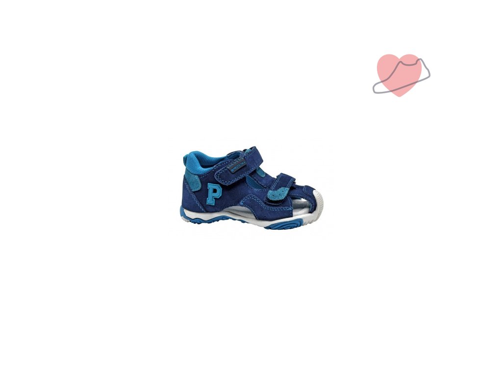 Chlapecké sandály v modré barvě, regulovatelné zapínáním na dva suché zipy. Pevná pata zabezpečí pro nohu dostatečnou oporu pro její rozvoj. Sandály jsou vypolstrované a mají koženou stélku s podporou klenby.