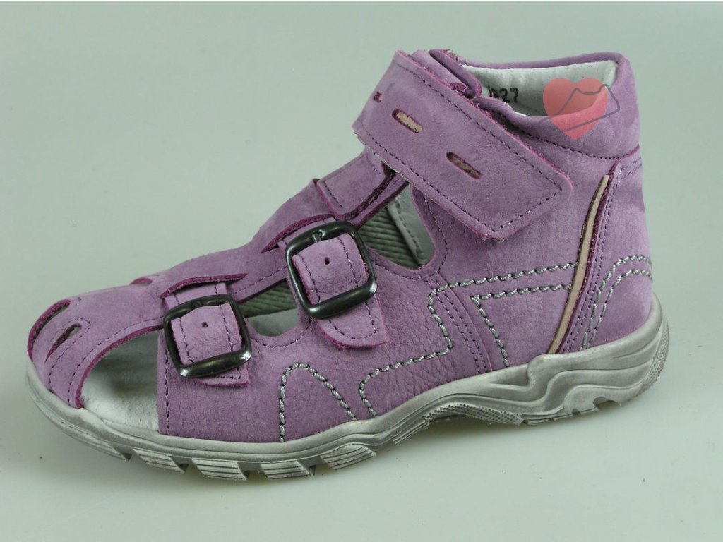 Dětský kožený zdravotní sandál s pevnou patou, koženou stélkou, který dobře drží kotníky ve správném postavení. Sandálky mají pásek přes špičku pro ochranu prstů. Střih dobře sedí, zapínání na suchý zip a dvě přezky přes prsty, dobrá konstrukce boty, kvalitní zpracování.