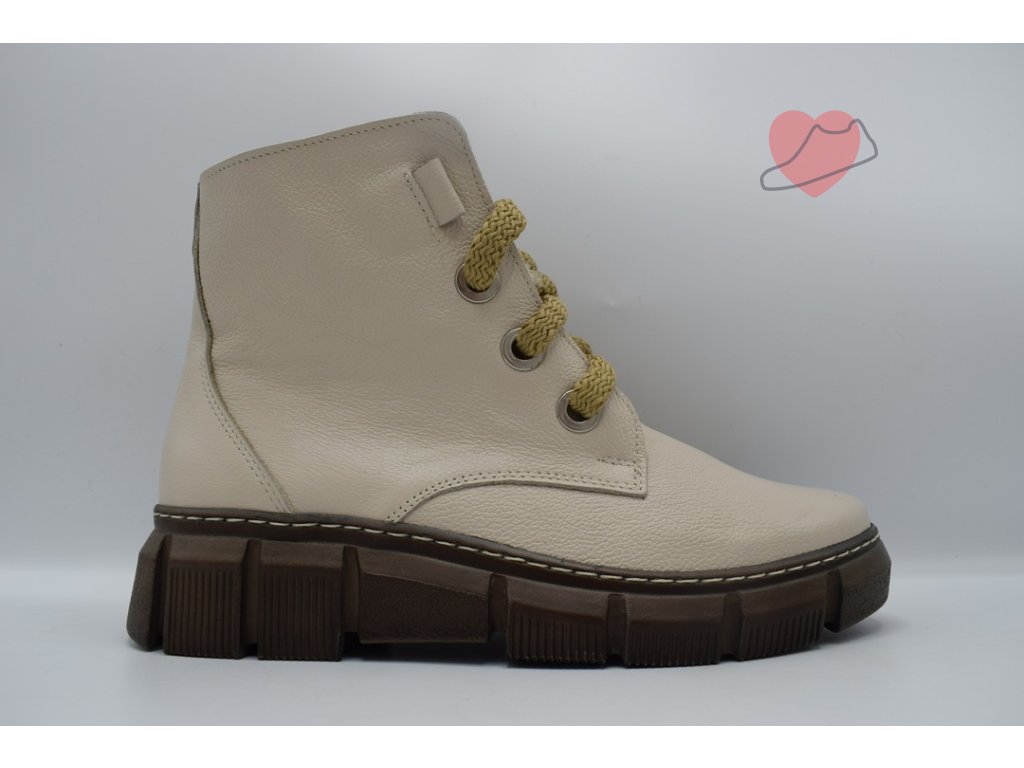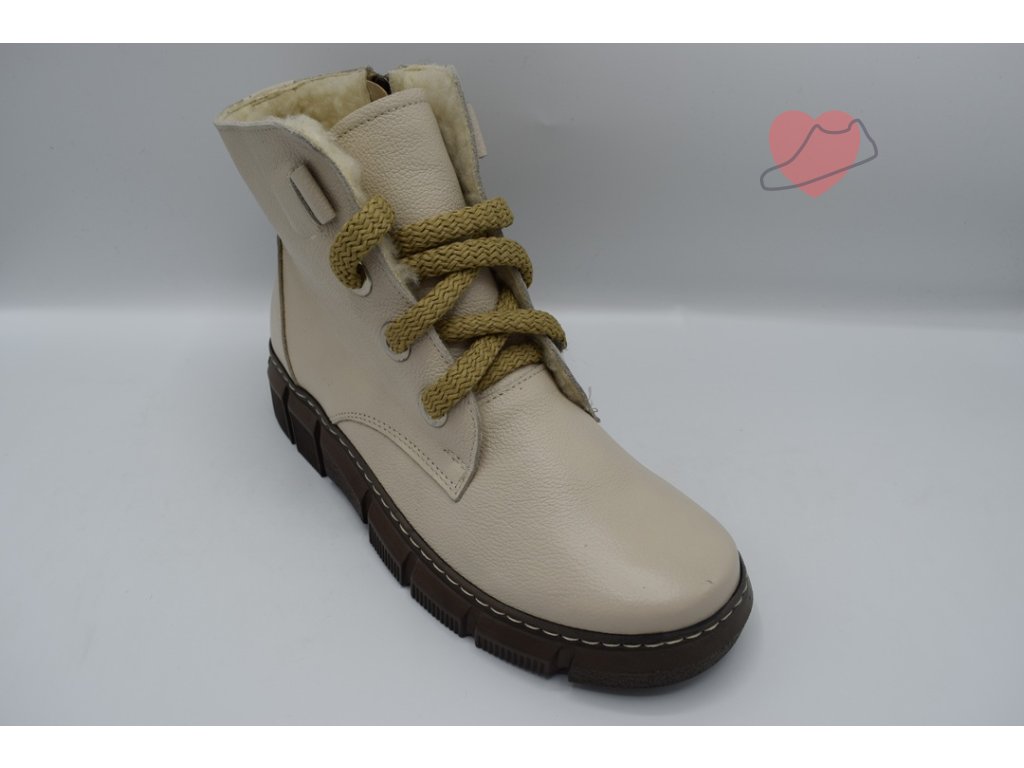 Dámské zimní boty v béžové barvě se zavazováním na tlustou tkaničku a postranním zipem. Svršek je vyroben z pravé kůže. Podšívka a stélka jsou zatepleny hřejivým beránkem.