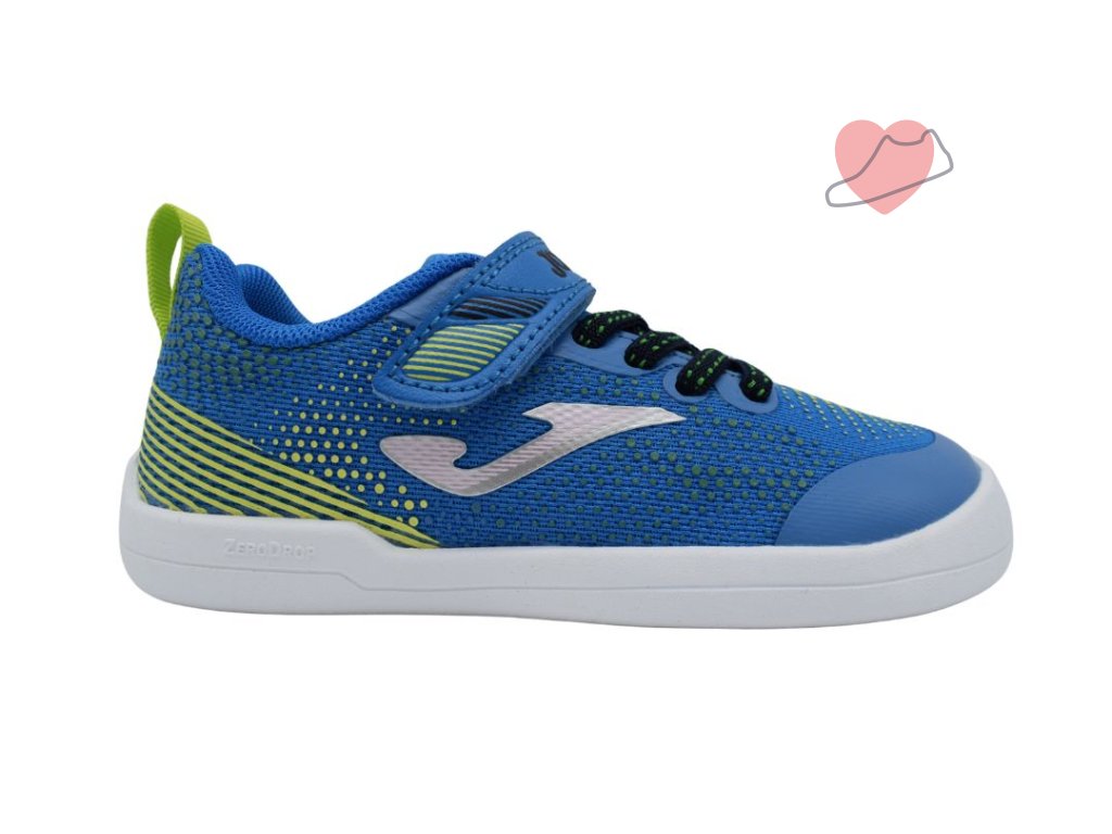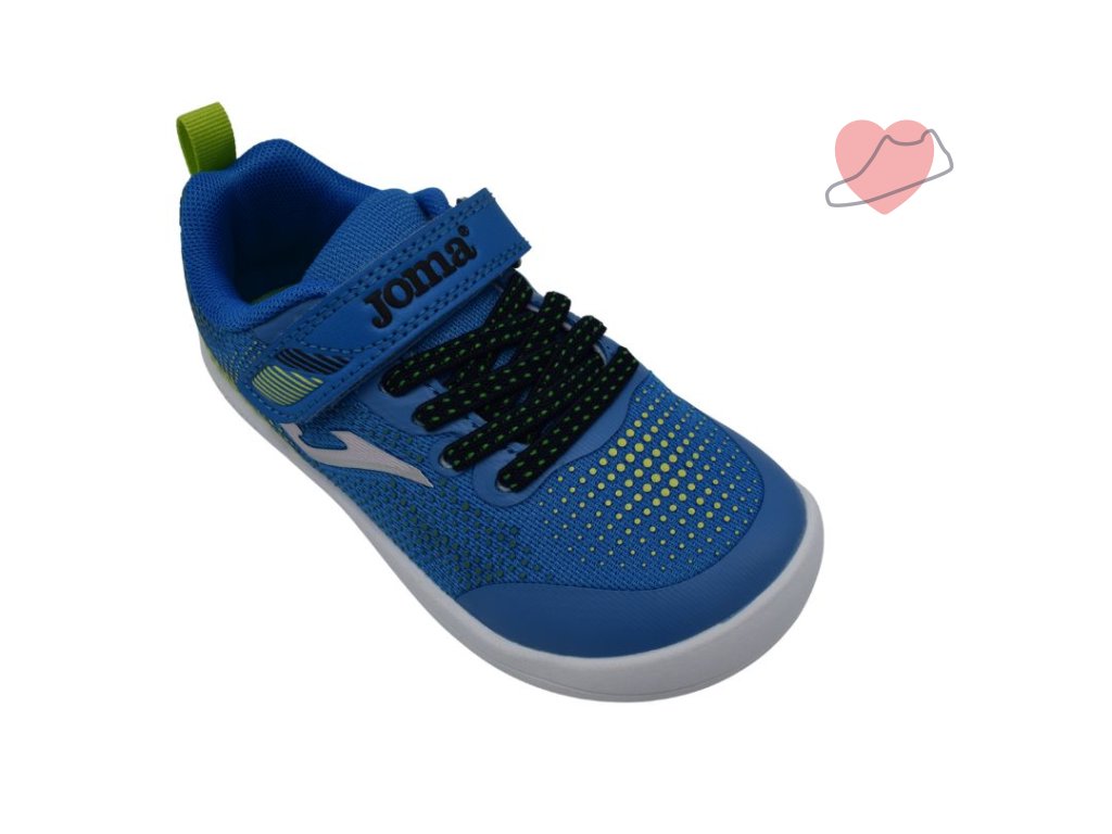 Dětské barefoot tenisky španělské značky Joma s velmi ohebnou podrážkou na suchý zip a kulatou prostornou špičkou pro prsty. Stélka je textilní a vyjímatelná bez anatomického tvarování. Boty jsou vhodné na normální až širší nohu a i na užší kotník.