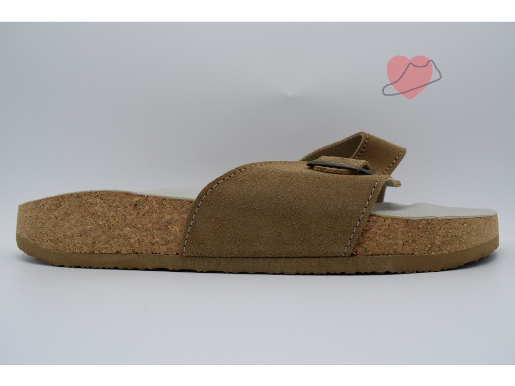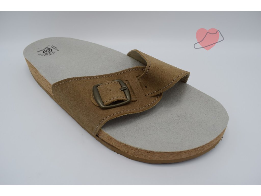 Zdravotní korkový pantofel s otevřenou špičkou v hnědé barvě. Anatomicky tvarovaná stélka a světlá podrážka jsou vhodné na venkovní i vnitřní užití. Regulace šířky na jednu přezku.