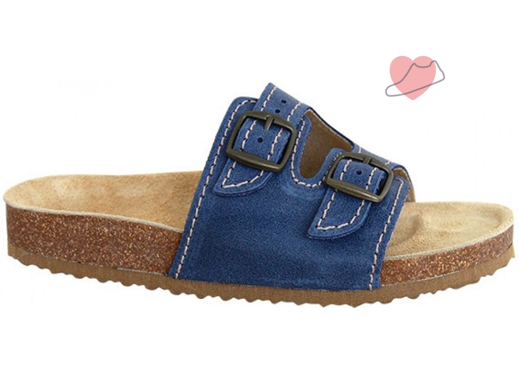 Zdravotní korkový pantofel s otevřenou špičkou v modré barvě. Anatomicky tvarovaná stélka a světlá podrážka jsou vhodné na venkovní i vnitřní užití. Regulace šířky na dvě přezky.