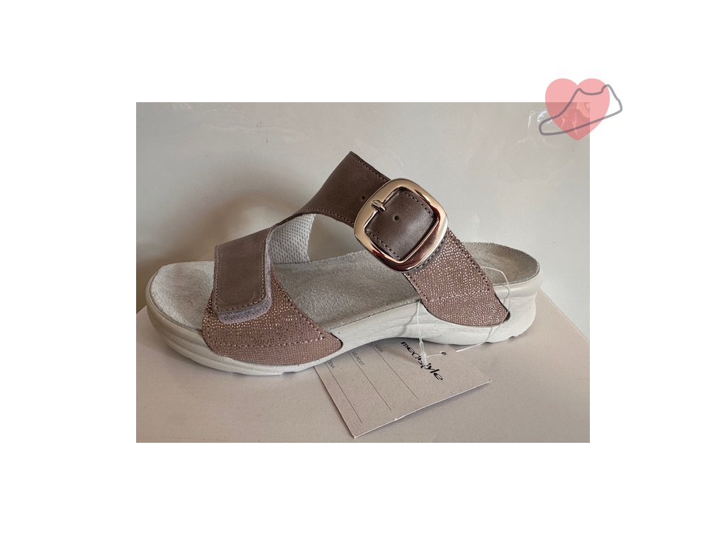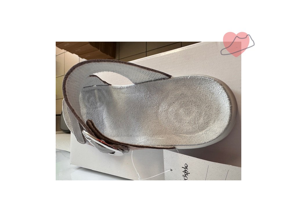 Dámský pantofel vhodný na ven, jako pracovní obuv nebo na doma. Regulace šířky dvěma pásky - spodní na suchý zip a horní na přezku. Svršek je vyroben z hladké kůže, stélka je kožená, anatomicky tvarovaná (po navlhnutí nutno nechat přirozeně vyschnout). Obuv vhodná na patní ostruhu, nadměrný nárt, kladívkové prsty a hallux.