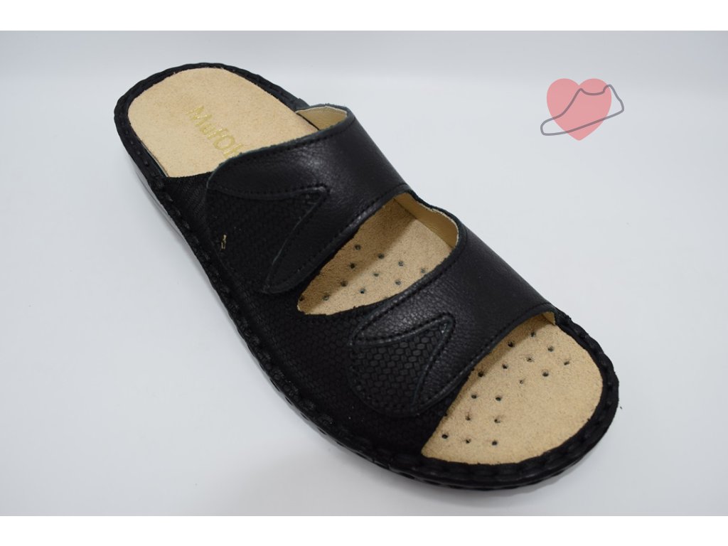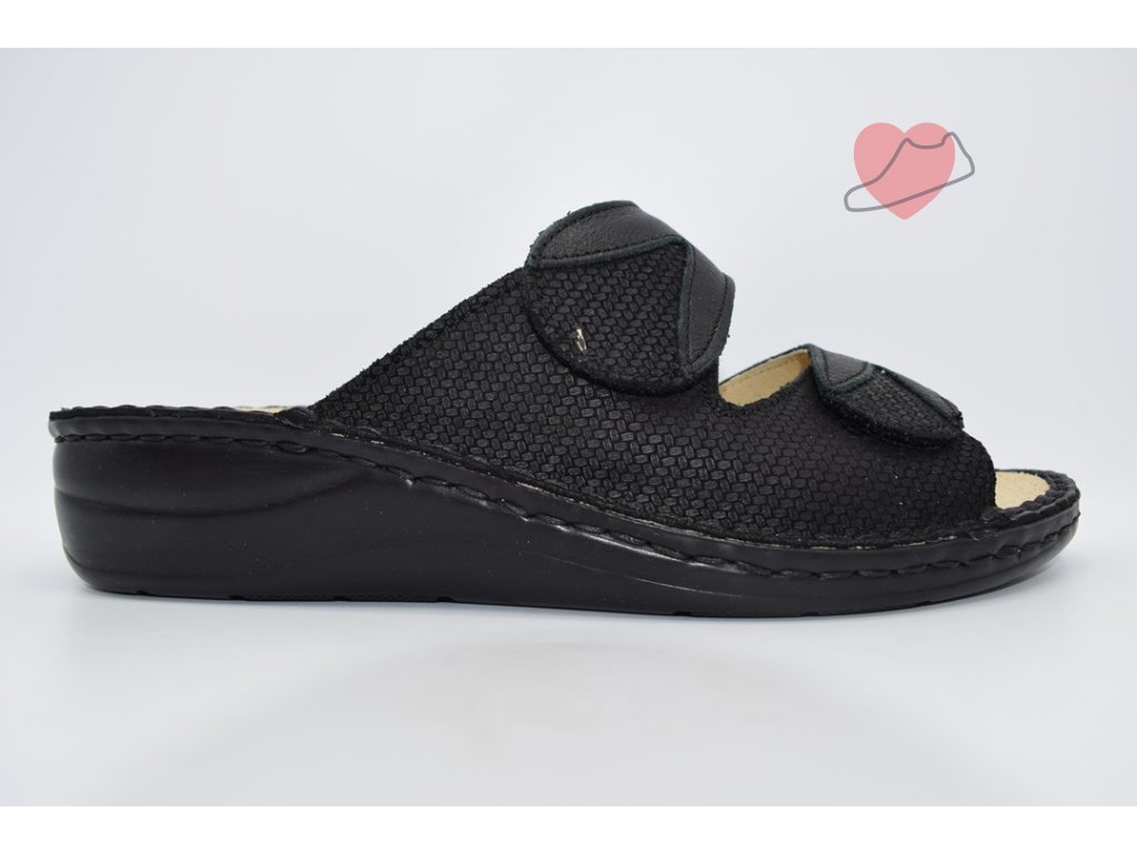 Dvoupáskové pantofle na suchý zip jsou vyrobené v šíři H,mají koženou podšívku i vrchní materiál,vyjímatelnou stélku a odpružený došlap na patě.Vyrobené v Itálii.