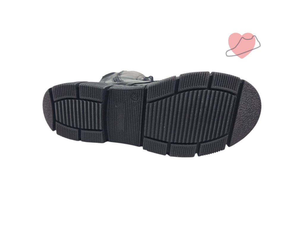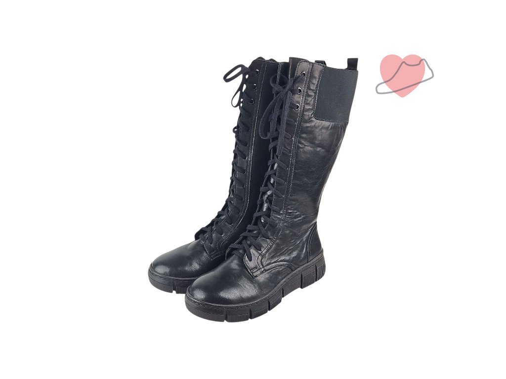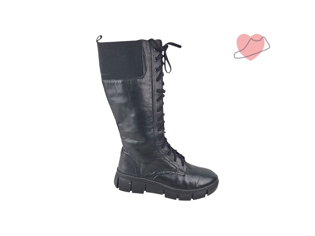 Černé zimní pohodlné kozačky s uzavíráním na zip z vnitřní strany. Obuv má na lýtku rozšíření na gumu. Nízký podpatek zajistí pohodlnou chůzi po celý den.