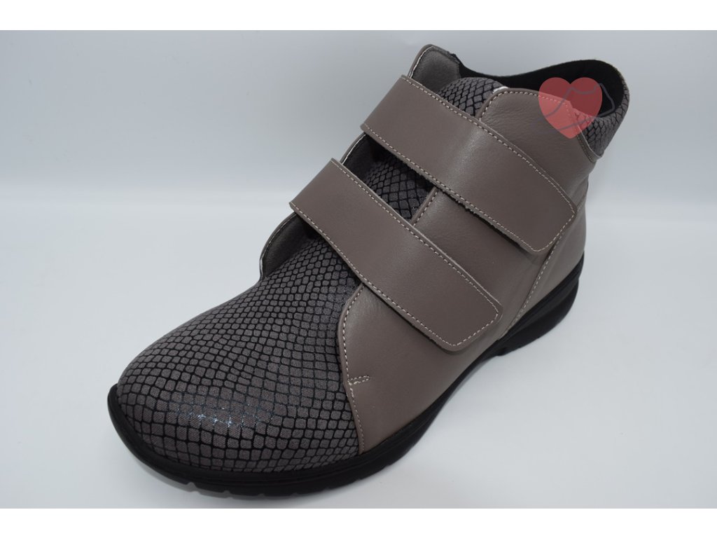 Dámská širší kožená kotníková obuv na dva suché zipy. Kůže je velmi měkká a ve přední části je materiálově uzpůsobena na deformace prstů a kloubu palce. Obuv vhodná pro haluxy. Protiskluzová podrážka.