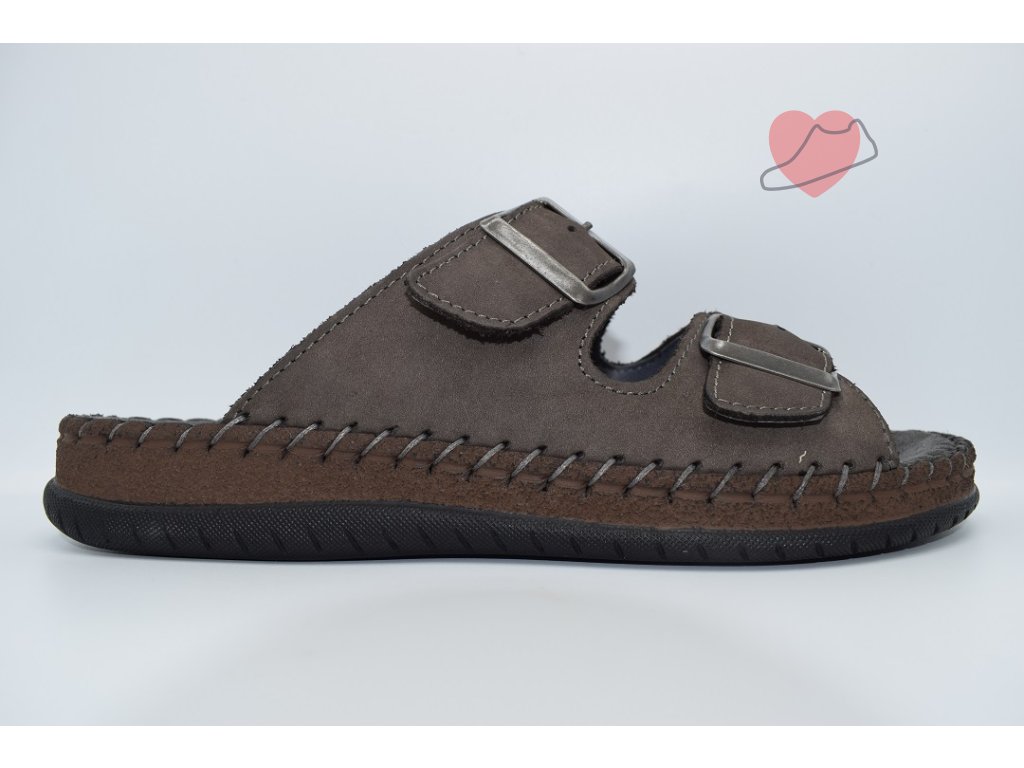 Pánský pantofel s regulovatelnou šířkou na dvě přezky. Rovná podešev a vyměkčená stélka zajistí komfort při celodenní chůzi. Vhodné na doma i na ven. Antishock pata.