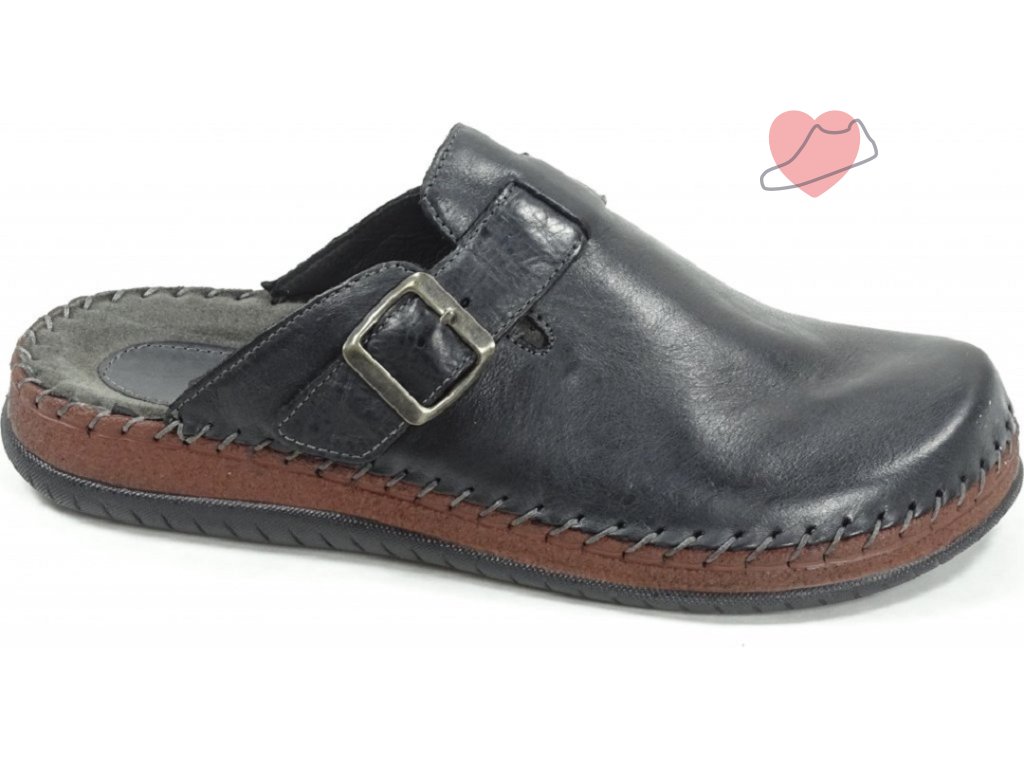 Pánský pantofel v černé barvě a s usňovým perforovaným svrchem a stélkou, pohodlná zdravotní obuv. Velmi měkká stélka se postará o Váš pohodlný každý krok. Zapínáním na přezku si obuv přizpůsobíte přímo své vlastní noze.