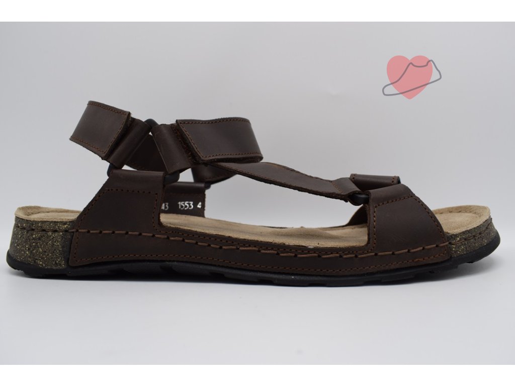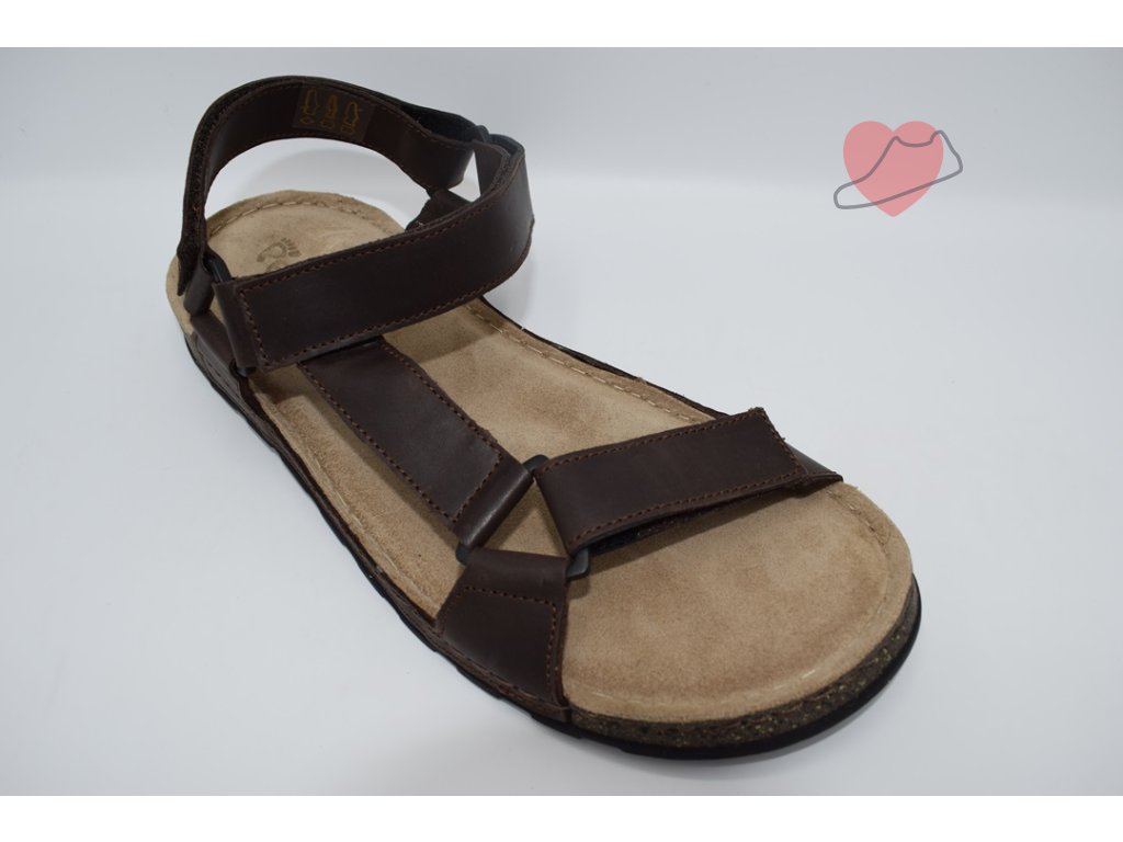 Pánský kožený sandál v hnědé barvě, nastavitelné pásky pomocí suchých zipů. Pružná podešev s koženou anatomicky tvarovanou stélkou se srdíčkem pro správnou podporu příčné i podélné klenby.