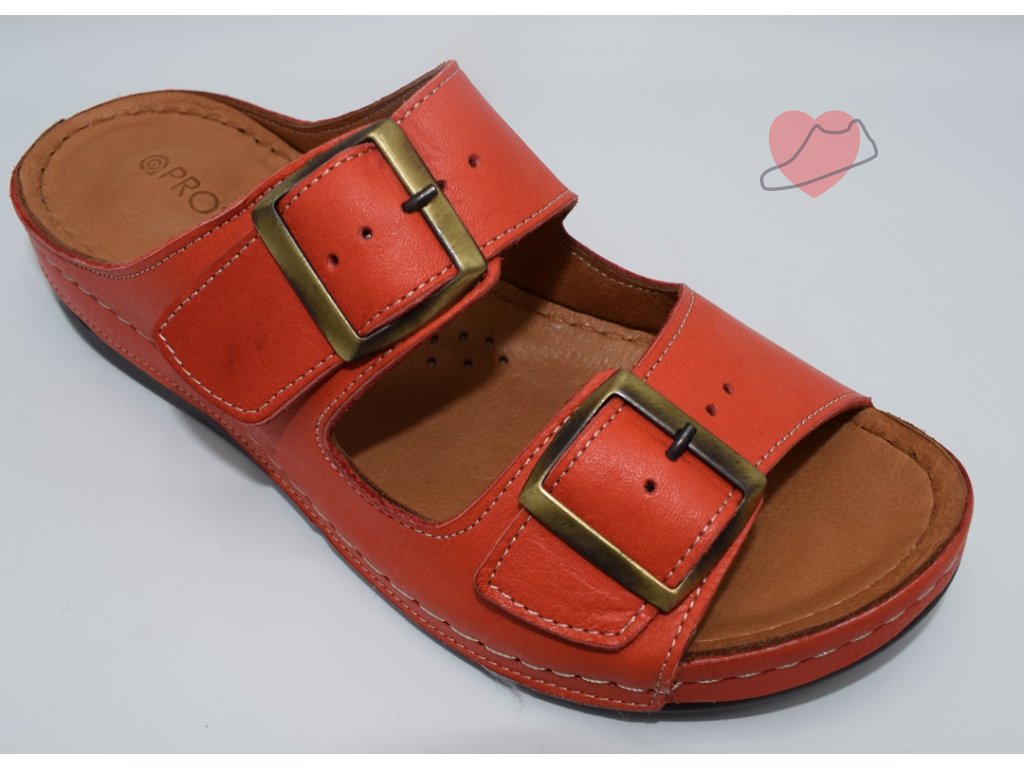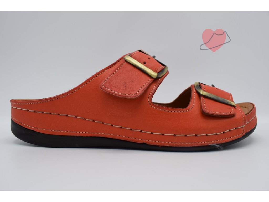 Komfortní pantofle s moderním a stylovým designem, které zachovávají všechny zdravotní výhody. Svršek těchto pantoflí je vyroben z kvalitní přírodní kůže v syté červené barvě. V oblasti nártu se nachází kovové přezky, které umožní, aby bota padla různé šíři nohy. Tyto pantofle jsou ideálním spojením stylu, pohodlí a zdravotních výhod, vhodné pro každodenní nošení. Stélka je měkká s podporou klenby a patním lůžkem.