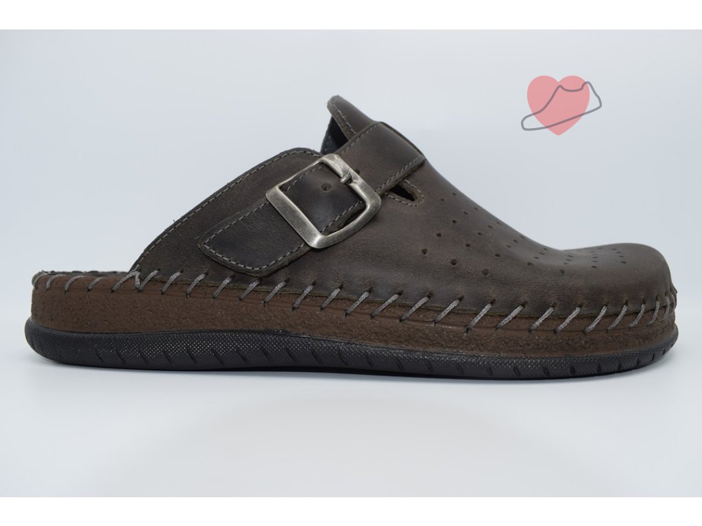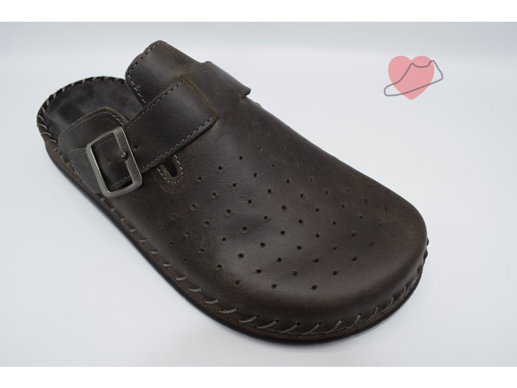 Pánský pantofel v hnědo-antracitové barvě a s usňovým perforovaným svrchem a stélkou, pohodlná zdravotní obuv. Zdobnými prvky je perforace po celém svršku a přezka, díky které si obuv přizpůsobíte přímo ke své noze.
