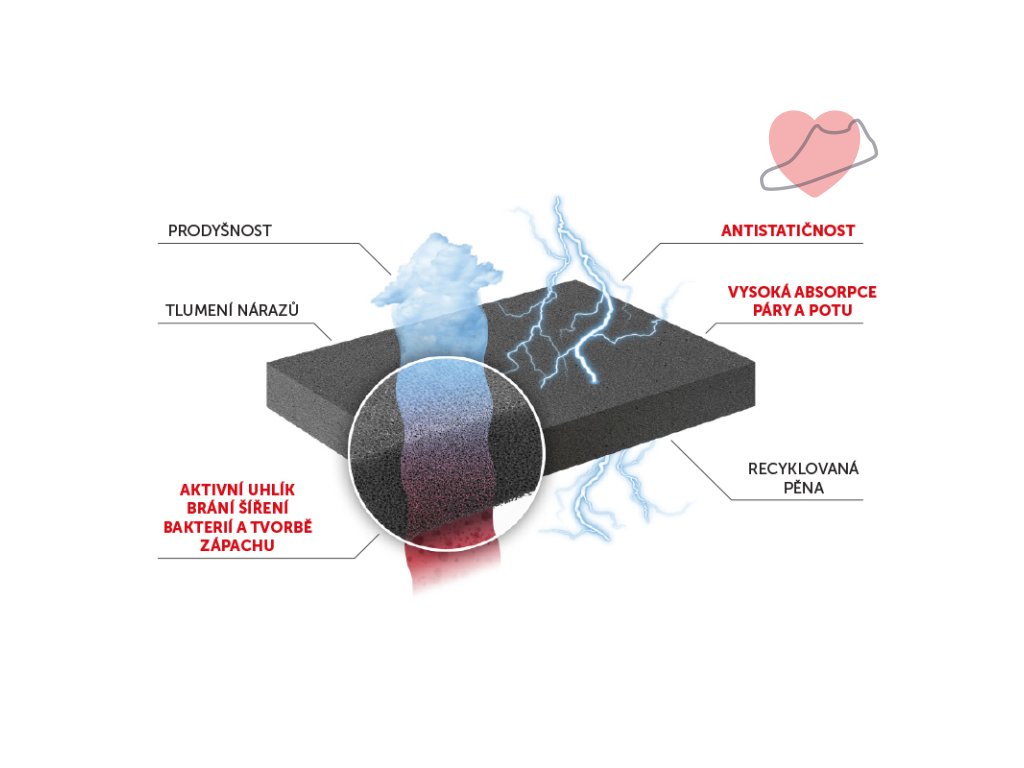 Jsou vyrobeny ze 100% recyklované antibakteriální a antistatické PU pěny s obsahem aktivního uhlíku, který výborně absorbuje vlhkost. Měkká a zároveň pružná struktura Integrované paměťové pěny, jejíž chování se mění v závislosti na teplotě, se přizpůsobí anatomii nohy a zajistí ideální rozložení tlaků plosky nohy.