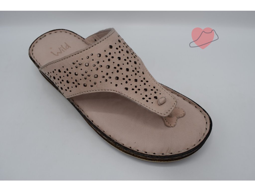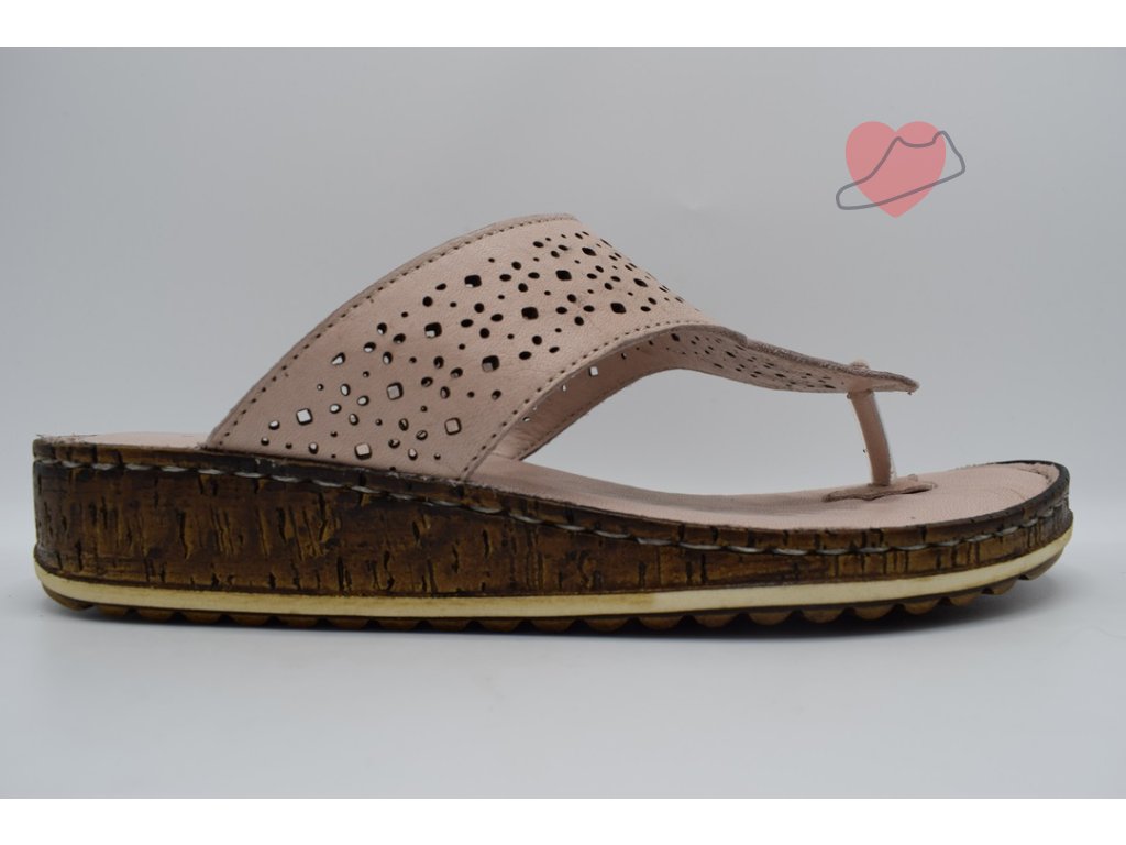 Dámské kožené žabky mají svršek s perforováním a pásek mezi prsty. Podešev je pod patou mírně zvýšená, stélka je vysoce polstrovaná, měkká, komfortní pro chodidla. Podešev je s imitací korku.