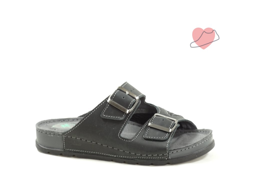 Pánský pohodlný pantofel s regulovatelnou šířkou na dvě přezky. Rovná podešev a vyměkčená anatomicky tvarovaná stélka zajistí komfort při celodenní chůzi. Vhodné na doma i na ven. Pantofel má pružnou vsadku, která je vhodná pro vbočený palec.